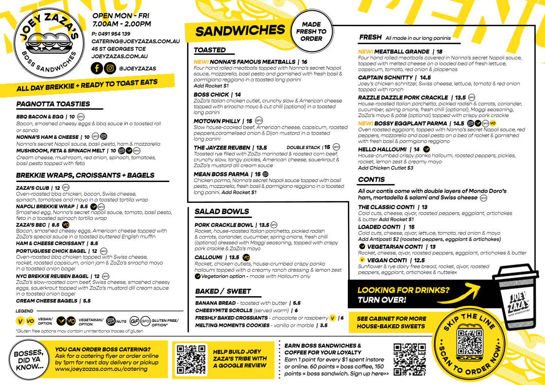 Welcome to Joey Zaza’s, a charming café located at 45 Saint Georges Terrace, Perth, where Italian-American cuisine collides delightfully. Renowned for its signature Boss Sandwiches, the Mortadella and Nonna’s Famous Meatballs stand out with rich flavors and fresh ingredients, encased in perfectly toasted bread.